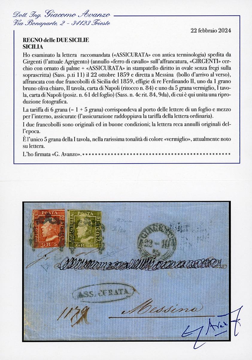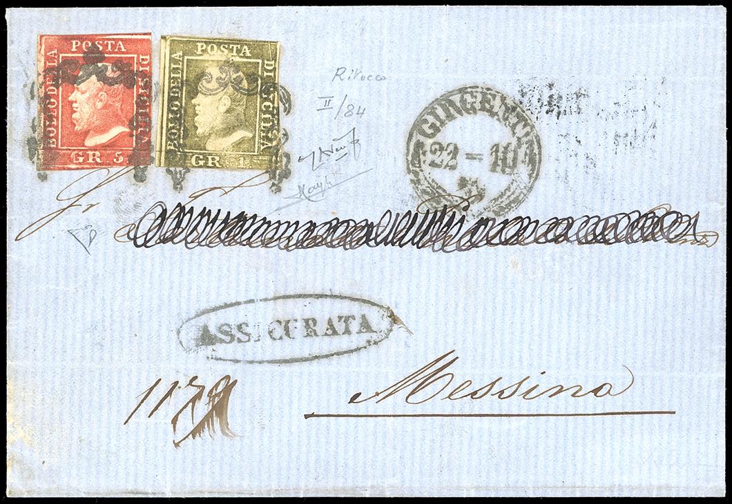 1859 - 5 grana vermiglio, I tavola, pos. 61, 1 grano bruno oliva chiaro, II tavola, ritocco pos. 84 (9da,4c), buono stato, su lettera assicurata di un foglio e mezzo da Girgenti 22/10/1859 a Messina. Si tratta dell'UNICO ESEMPLARE DEL 5 GRANA I TAVOLA DI QUESTA RARISSIMA TONALITA' DI COLORE NOTO SU LETTERA. Eccezionale ed inedito nuovo ritrovamento, per grande collezione specializzata. E.Diena, Raybaudi, dettagliato cert. Avanzo.
