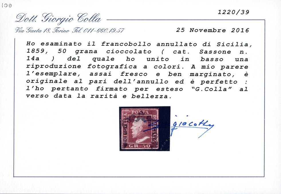 1859 - 50 grana cioccolato (14a), perfetto, grandi margini, usato. Splendido e molto fresco. Giulio Bolaffi per esteso, A.Diena, Ferrario, ... Read more