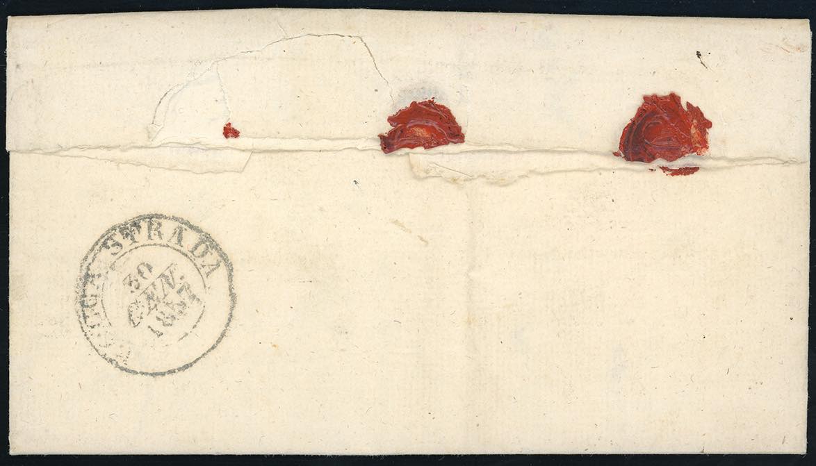 1857 - 2 crazie verde azzurro su grigio (5f), due margini enormi, sfiorato in alto, su lettera assicurata, bollo "per consegna" in rosso, da Firenze 27/1/1857 a Roccastrada, manoscritto "franca con L.1.6.8.". Interessante e rara tariffa, pochissimi casi noti. Cert. Ferrario. Ex coll. Imperato.