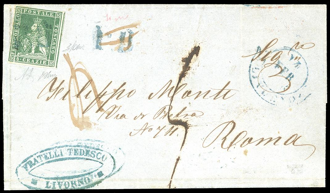1855 - 4 crazie verde su grigio (6), perfetto, su lettera insufficientemente affrancata da Livorno 14/2/1855 a Roma, bollo P.D. cassato e tassata inizialmente 4 crazie, poi convertitit in 5 bajocchi in arrivo. Non comune e interessante. G.Oliva, A.Diena. Ex coll. Imperato.