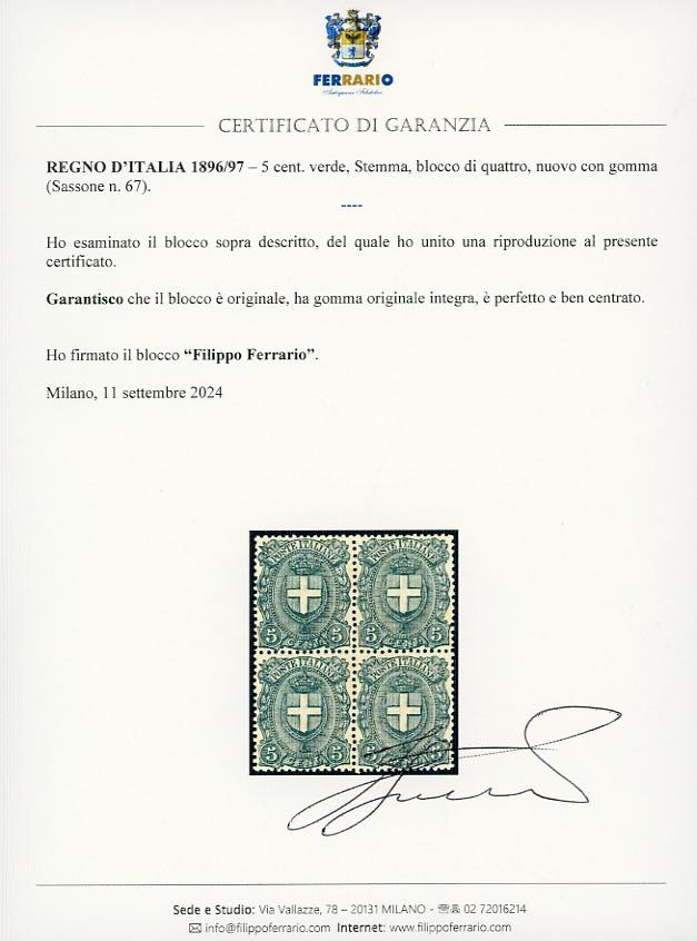 1896/97 - Stemma, serie completa (65/67), ottima centratura, blocchi di quattro, gomma originale integra, perfetti. Cert. Ferrario per il 5 ... Read more