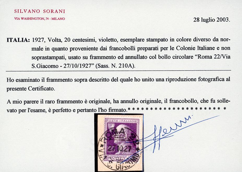 1927 - 20 cent. Volta violetto, errore di colore (210A), perfetto, usato su piccolo frammento (dal quale venne sollevato per verifica e riapplicato con linguella) a Roma 27/10/1927. Molto raro, pochissimi esemplari noti allo stato di usato. G.Oliva, cert. Sorani.