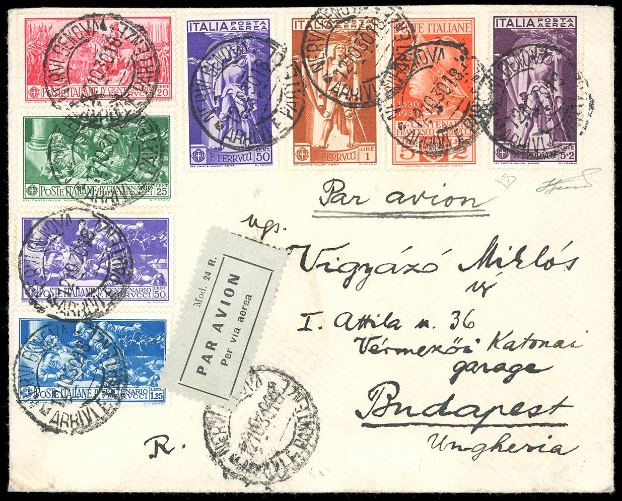 1930 - Ferrucci, serie completa (376/280+A), perfetti, su aerogramma da Genova Nervi 12/10/1930 a Budapest, in Ungheria, bolli di transito ... Read more