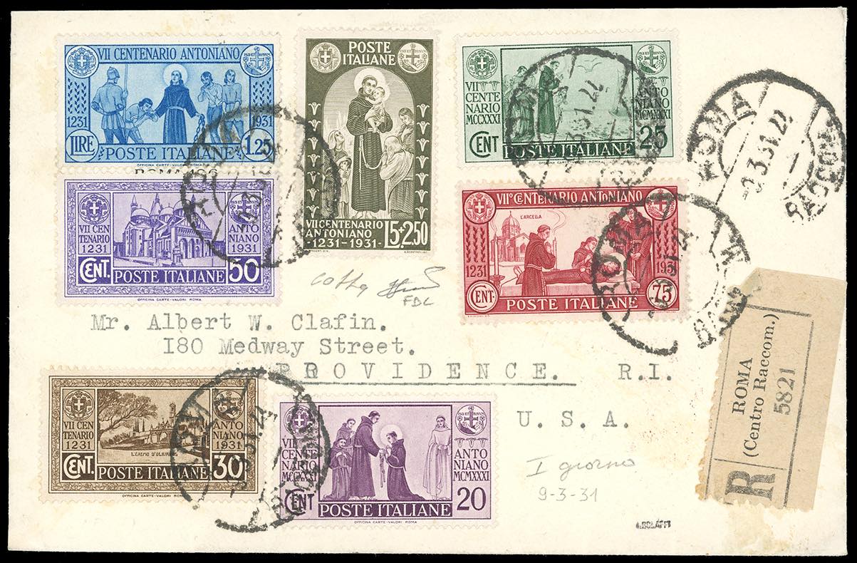 1931 - S. Antonio, serie completa di 7 valori (293,298), perfetti, su busta raccomandata da Roma 9/3/1931, primo giorno d'emissione, per gli Stati Uniti, bollo d'arrivo al verso. Non comune e di ottima qualità. Colla, Ferrario.