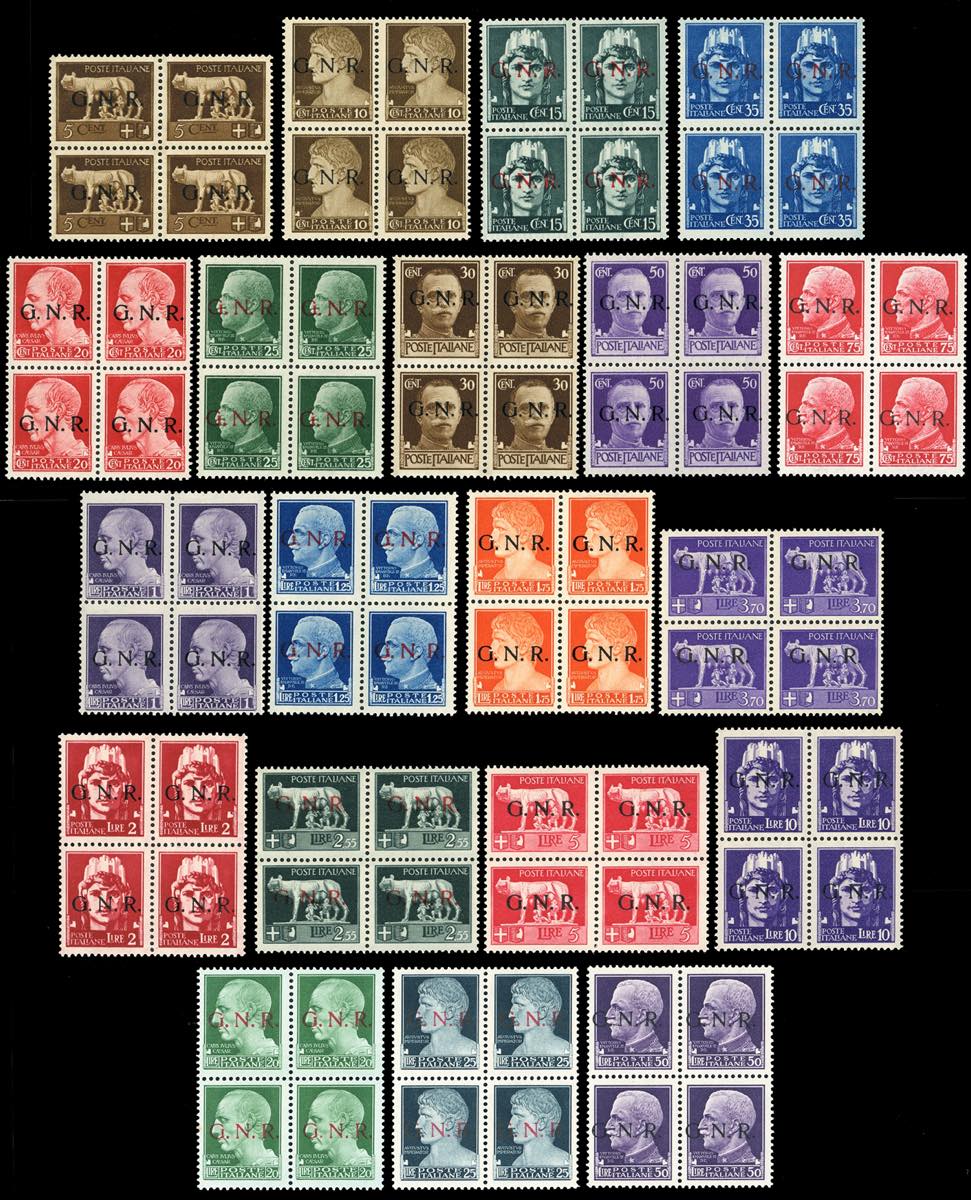 1944 - Soprastampati G.N.R. tiratura di Verona, serie completa (470/489), blocchi di quattro nuovi, gomma originale integra, perfetti. Rari e di ottima qualità. Cert. Oro Raybaudi per gli alti valori.