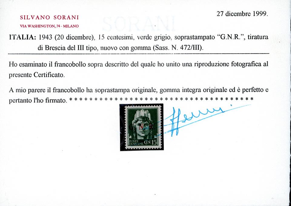 1943 - Soprastampati G.N.R., tiratura di Brescia, III tipo, serie completa (472/III-488/III), nuovi, gomma originale integra, perfetti. Raro insieme, di ottima qualità. Fiecchi per quattro valori, quattro cert. Sorani e due Raybaudi.
