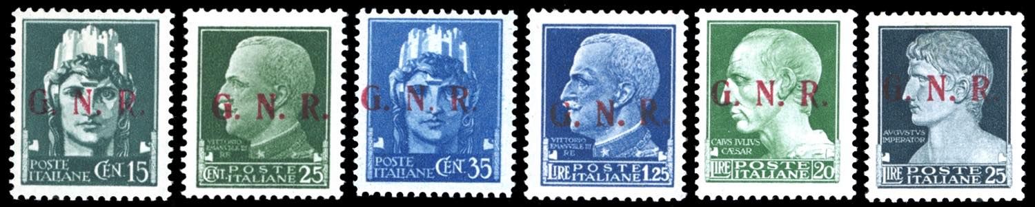 1943 - Soprastampati G.N.R., tiratura di Brescia, III tipo, serie completa (472/III-488/III), nuovi, gomma originale integra, perfetti. ... Read more