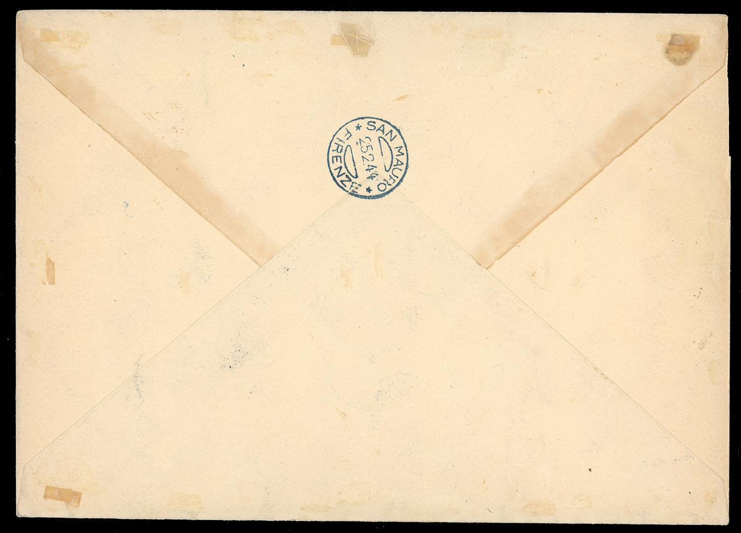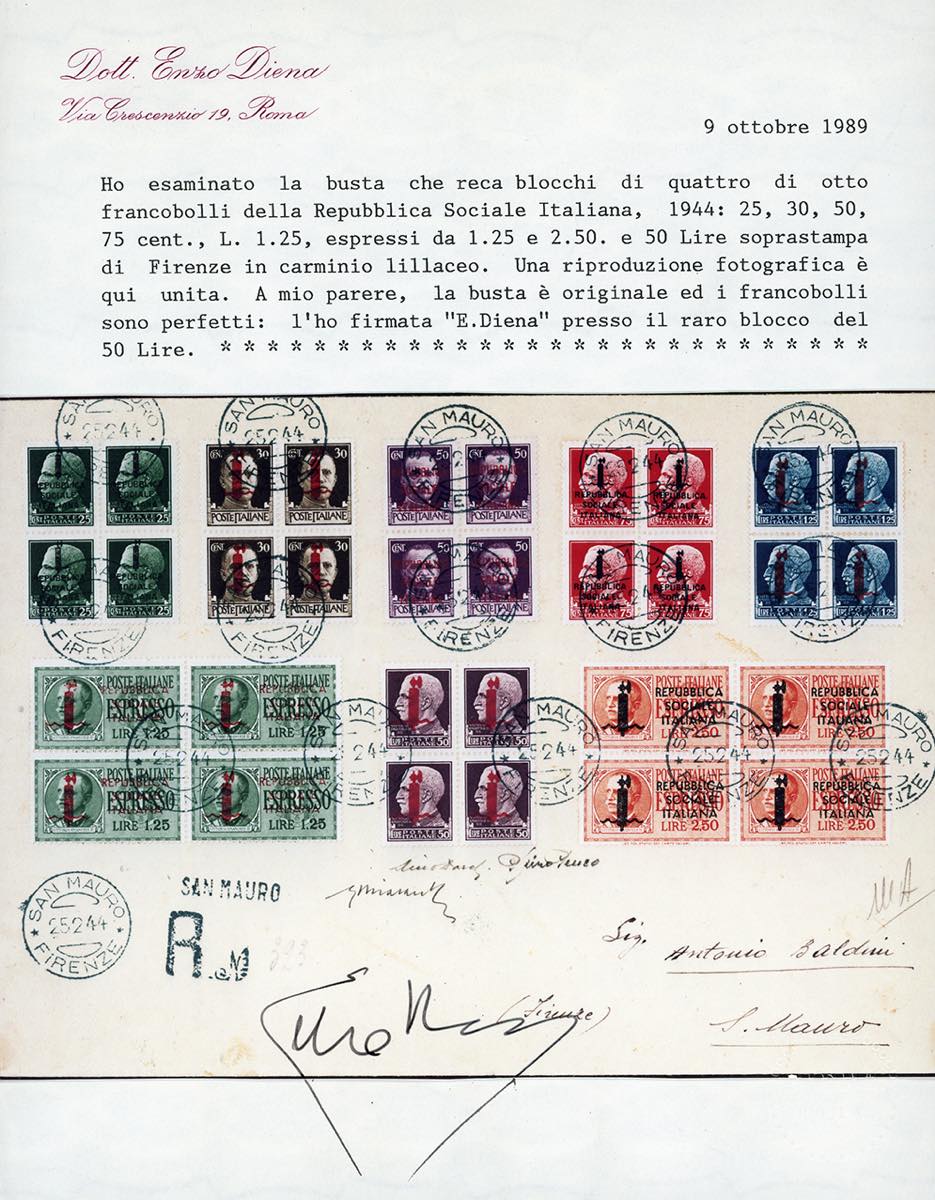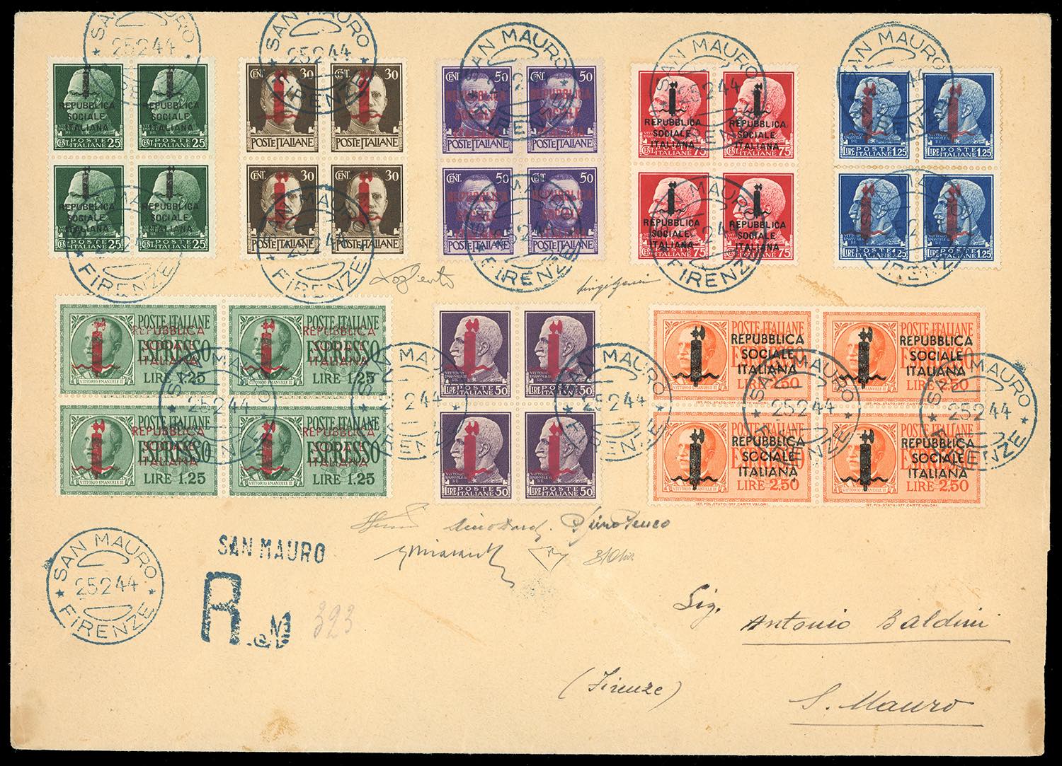 1944 - 50 lire soprastampa fascio in carminio lillaceo, tiratura di Firenze, con complementari soprastampati ed espressi (500/I,491/495,E21/22), tutti in blocchi di quattro, perfetti, su busta raccomandata da San Mauro 25/2/1944 per città. Rarità assoluta della Repubblica Sociale. E' L'UNICA QUARTINA NOTA DEL 50 LIRE N. 500/I SU BUSTA. Penco, Chiavarello, Dino Dardi, cert. E.Diena, Ferrario, L.Gazzi.