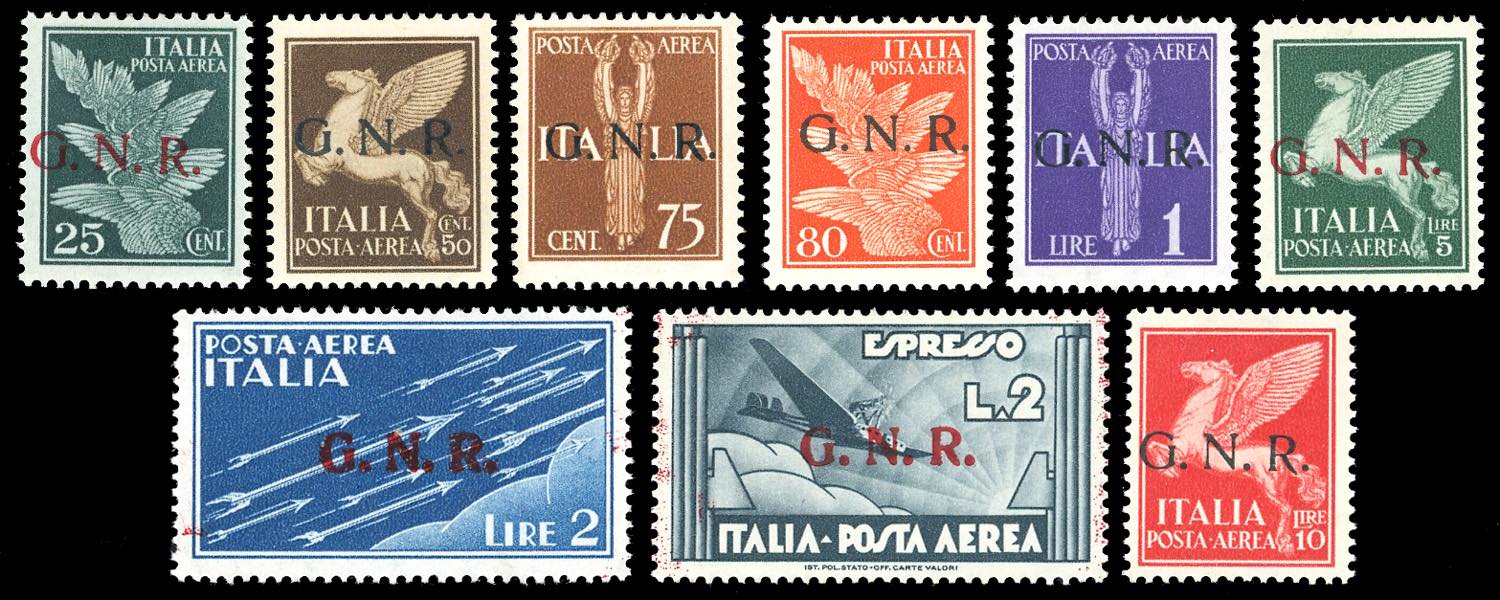 1944 - Soprastampati G.N.R., tiratura di Verona, serie completa (117/125), nuovi, gomma originale, perfetti. Firmati Sassone e Ferrario.
