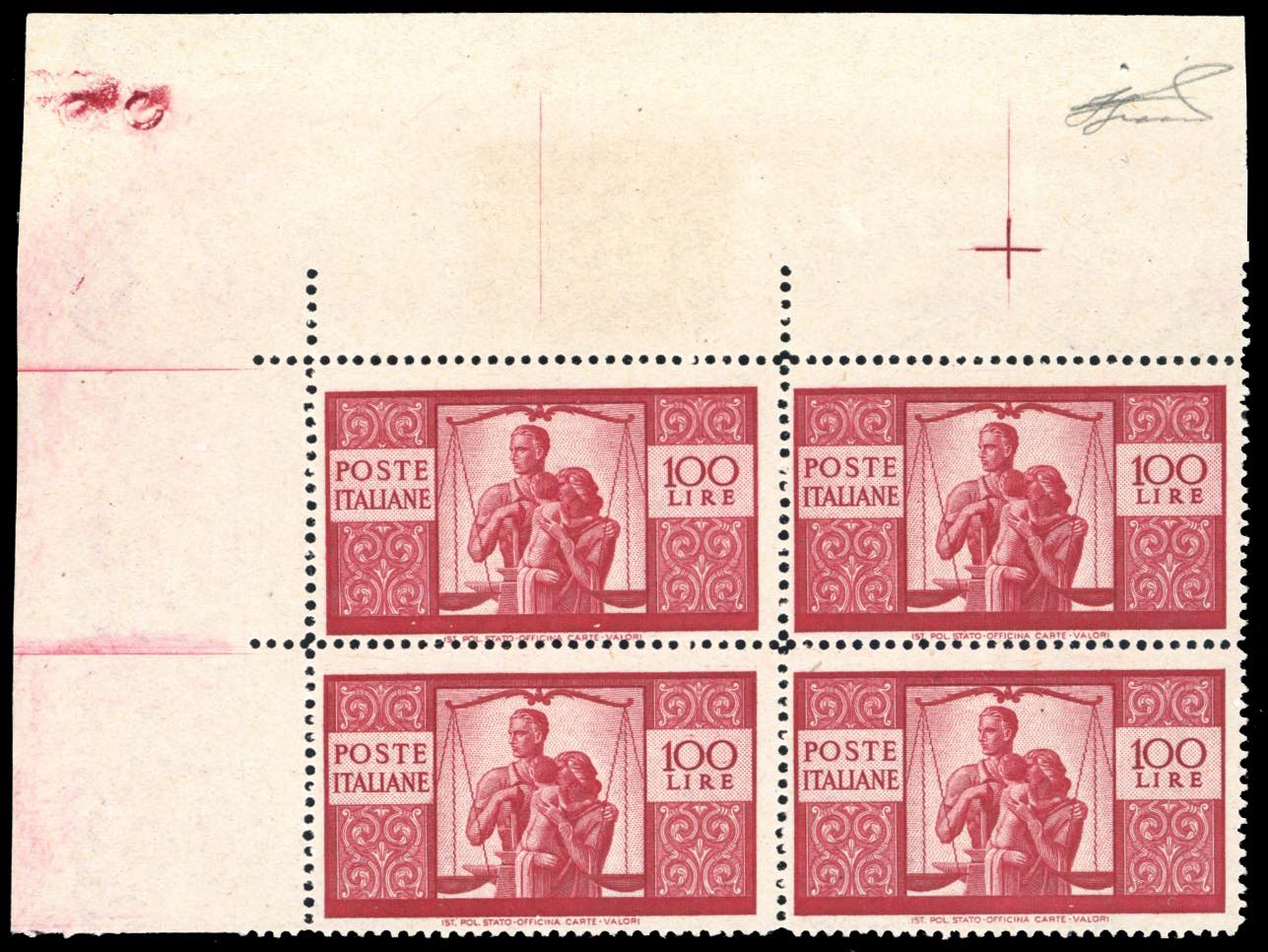 1946 - 100 lire Democratica, I lastra, dent. 14 x 14 1/4, blocco di quattro, angolo di foglio senza diciture, pos. 1-2 e 11-12, doppia ... Read more