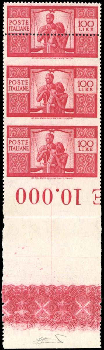 1946 - 100 lire Democratica, II lastra, dent. 14 x 13 1/4, carta grigia, striscia verticale di tre, il primo esemplare con dentellatura inferiore fortemente spostata in alto (al centro), gli altri non dentellati orizzontalmente (Sass.spec.24Eb,24Ec), ampio bordo di foglio in basso, gomma originale integra, perfetta. Molto bella e rara. Ferrario.