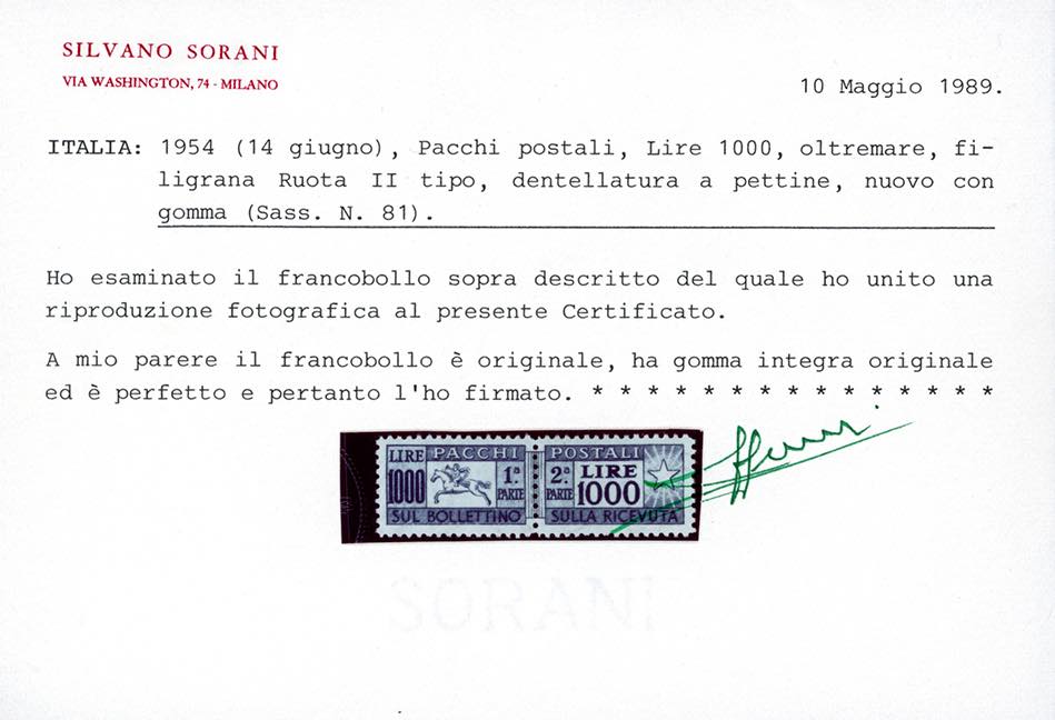 1954 - 1.000 lire Cavallino, filigrana ruota (81), ottima centratura, gomma originale integra, perfetto. Cert. Sorani.