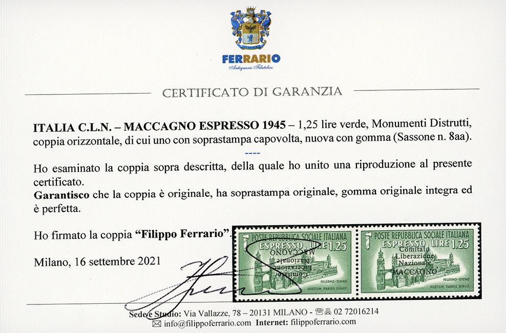 MACCAGNO 1945 - Monumenti Distrutti, soprastampa capovolta, sette esemplari, quattro in coppia con il normale (1a,2a,3a,4aa,5aa,6aa,8aa), gomma originale integra, perfetti. Raro insieme, di ottima qualità. Firmati Raybaudi/Sassone/Ferrario, cert. Ferrario per il n. 8aa.