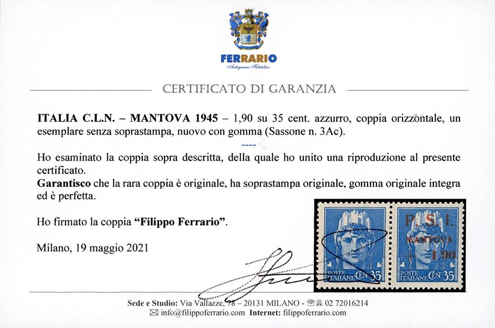 MANTOVA 1945 - 1,90 lire + 35 cent. Imperiale, errore di valore, coppia orizzontale di cui uno senza soprastampa (3Ac), nuova, gomma ... Read more