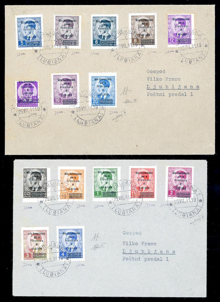 LUBIANA 1941 - Alto Commissariato, serie completa (42/56), perfetti ad eccezione del 3 d. che presenta tracce d'ossidazione, su due buste da Lubiana 29/8/1941 per città, bollo d'arrivo. Raro insieme. Ferrario, A.Diena, J.Bar, cert. Avanzo.