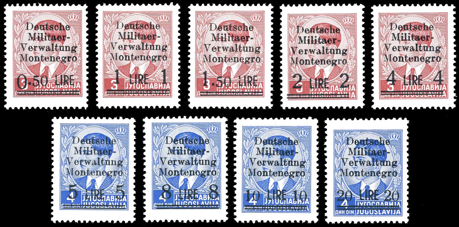 OCCUPAZIONE TEDESCA MONTENEGRO 1943 - Soprastampati, serie completa (1/9), nuovi, gomma originale integra, perfetti. Ottima qualità.