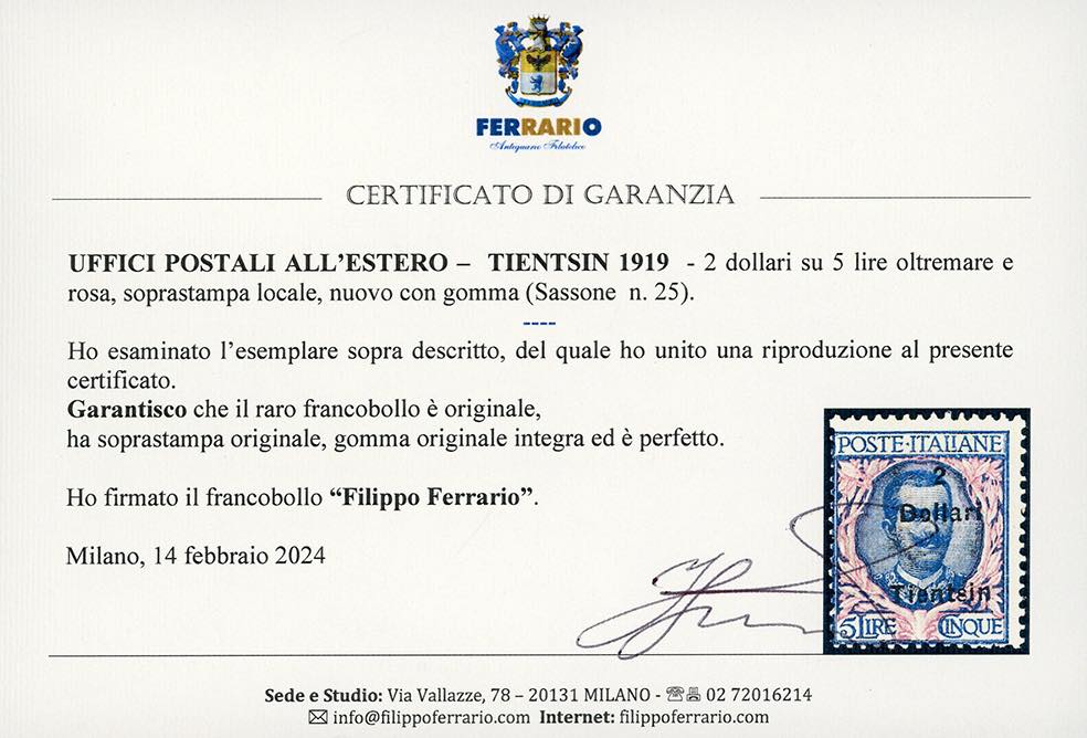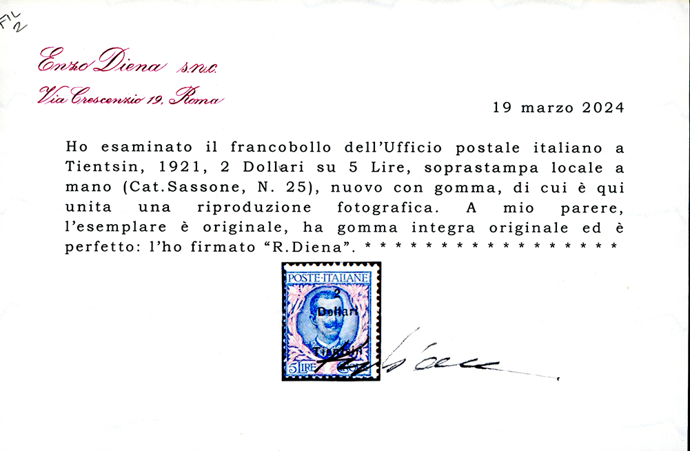 TIENTSIN 1921 - 2 d. su 5 lire soprastampato localmente (25), gomma originale integra, perfetto. Raro. Cert. Alberto Diena, R.Diena e Ferrario.