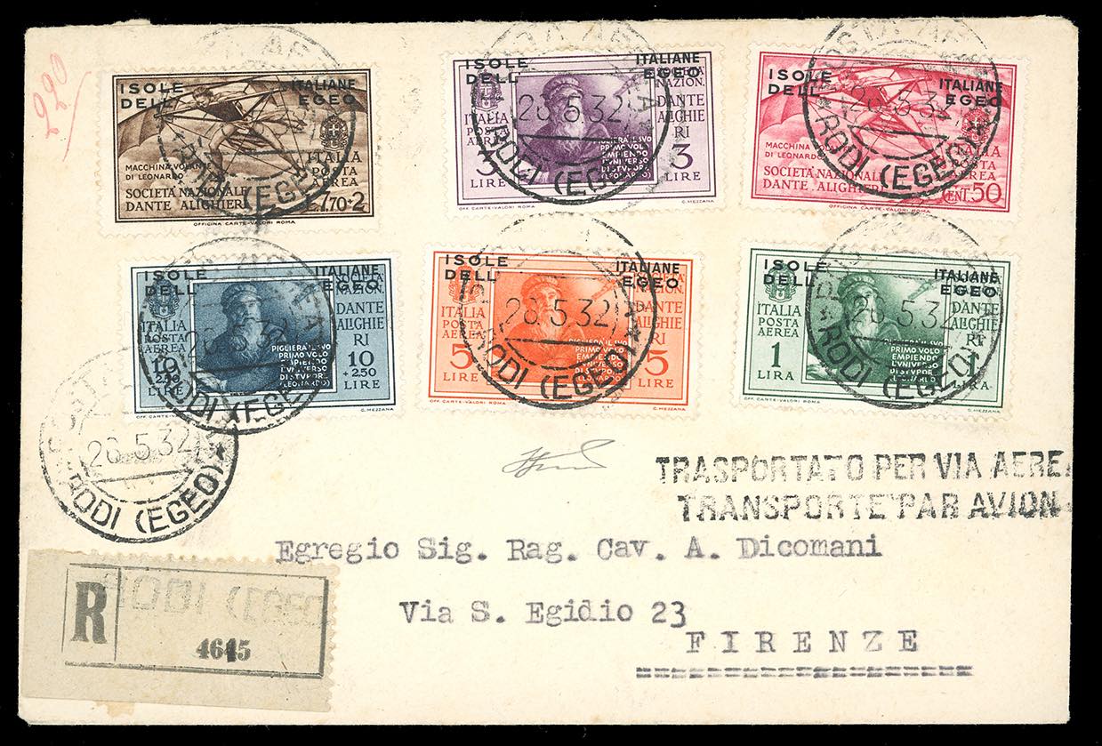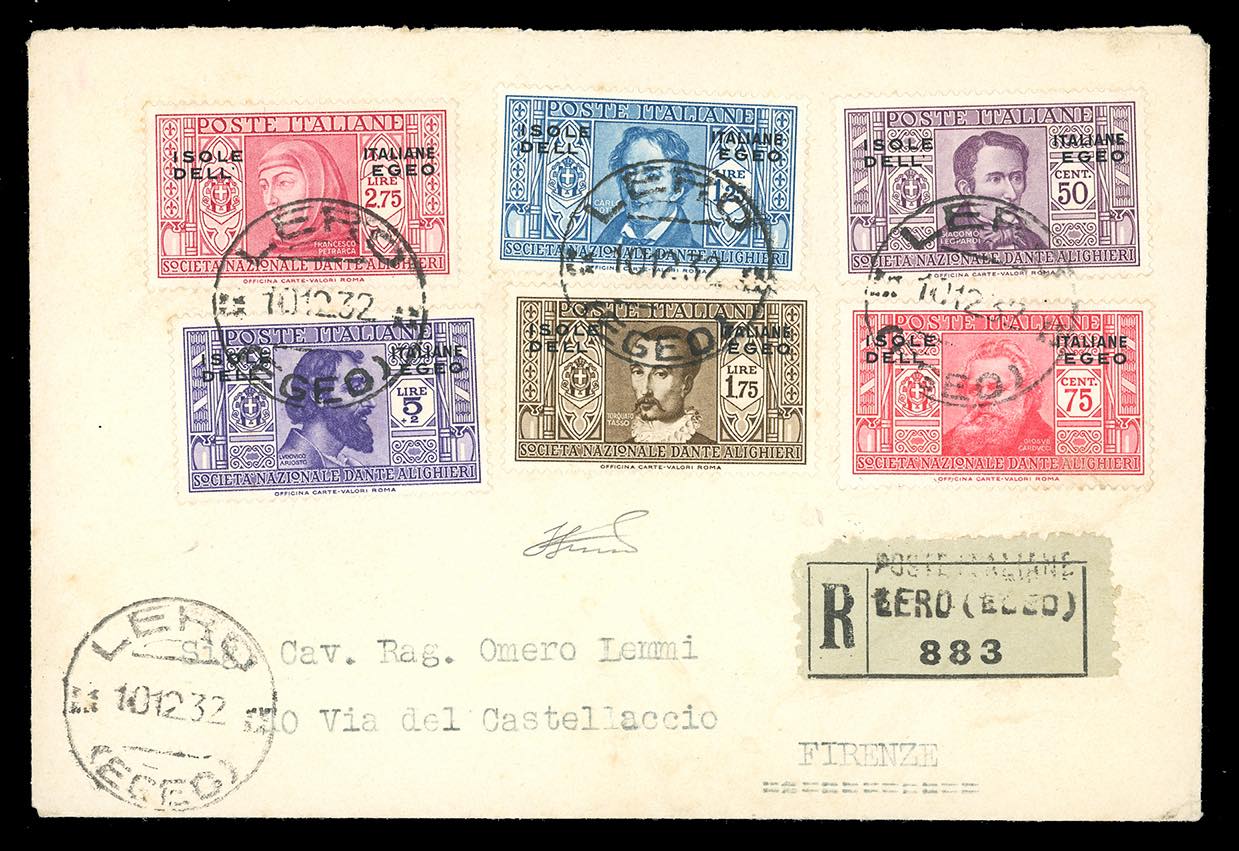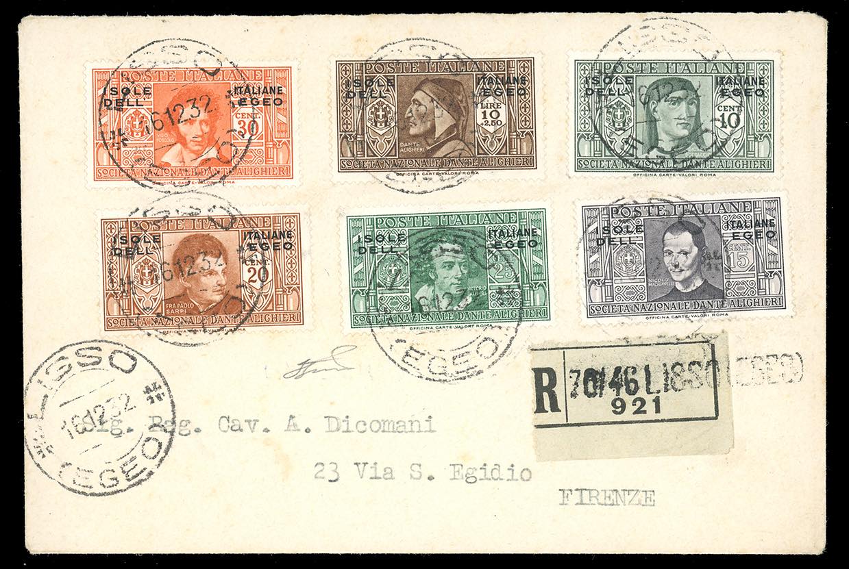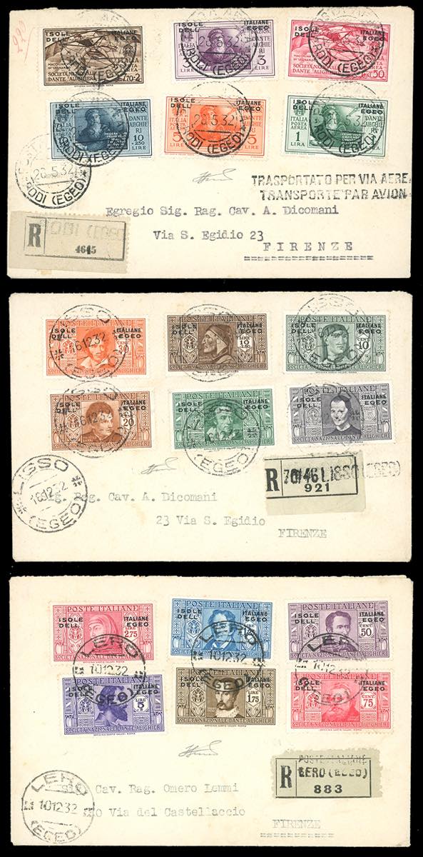 1932 - Dante Alighieri, serie completa (44/55+A8/A13), perfetti, su tre buste raccomandate viaggiate dirette a Firenze. Non comuni. Ferrario.
