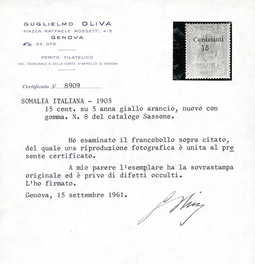 1905 - Soprastampati di Zanzibar, serie completa (8/9), gomma originale integra, perfetti. Il 15 cent. Em.Diena, Ghiglione e cert. Oliva, ... Read more