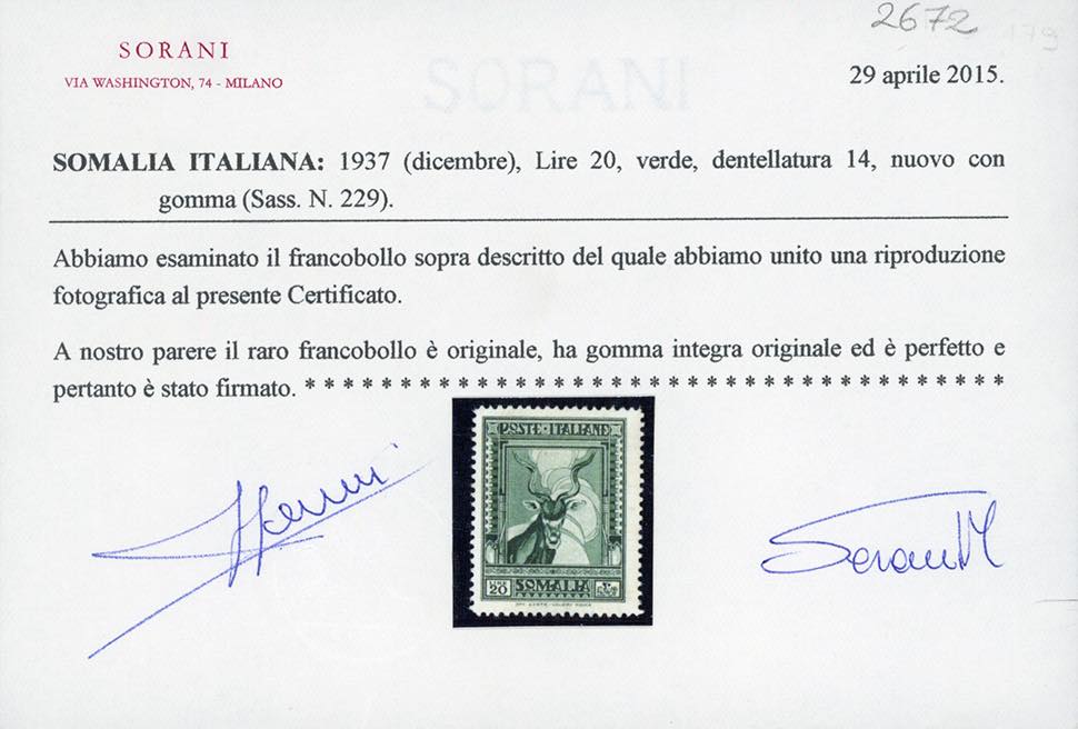 1937 - 20 lire verde Pittorica, dent. 14, detto "Cervo di Somalia" (229), nuovo, gomma originale integra, perfetto. Molto fresco e ben conservato. Rarità del settore. Cert. Sorani e Ferrario.