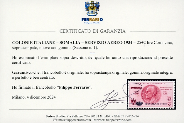 SERVIZIO AEREO 1934 - 25 + 2 lire Coroncina (1), nuovo, gomma originale integra, perfetto. Molto fresco e ben centrato. A.Diena, cert. Ferrario.