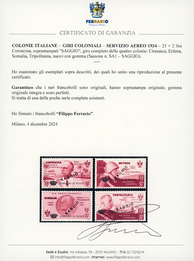 SERVIZIO AEREO 1934 - 25 + 2 lire Coroncina, soprastampati "SAGGIO" (SA1), giro completa delle quattro colonie: Cirenaica, Eritrea, Somalia, Tripolitania. Gomma originale integra, perfetti. Splendidi e rari, poche serie complete esistenti. Alberto Diena, Giulio Bolaffi, cert. Ferrario.