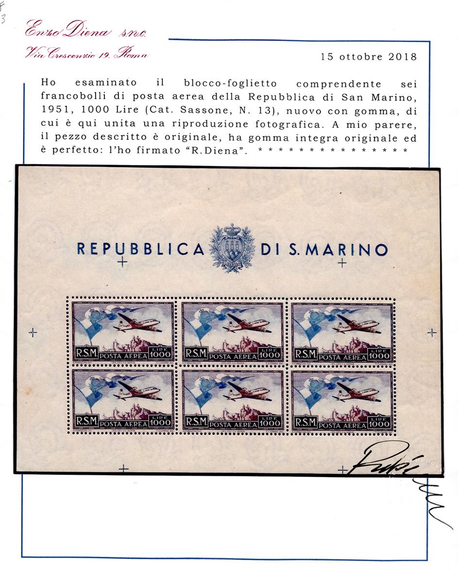 1951 - 1.000 lire Bandierone, foglietto (13), nuovo, gomma originale integra, perfetto. Raro. Cert. Diena e Ferrario.