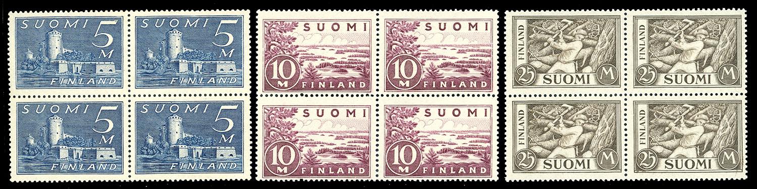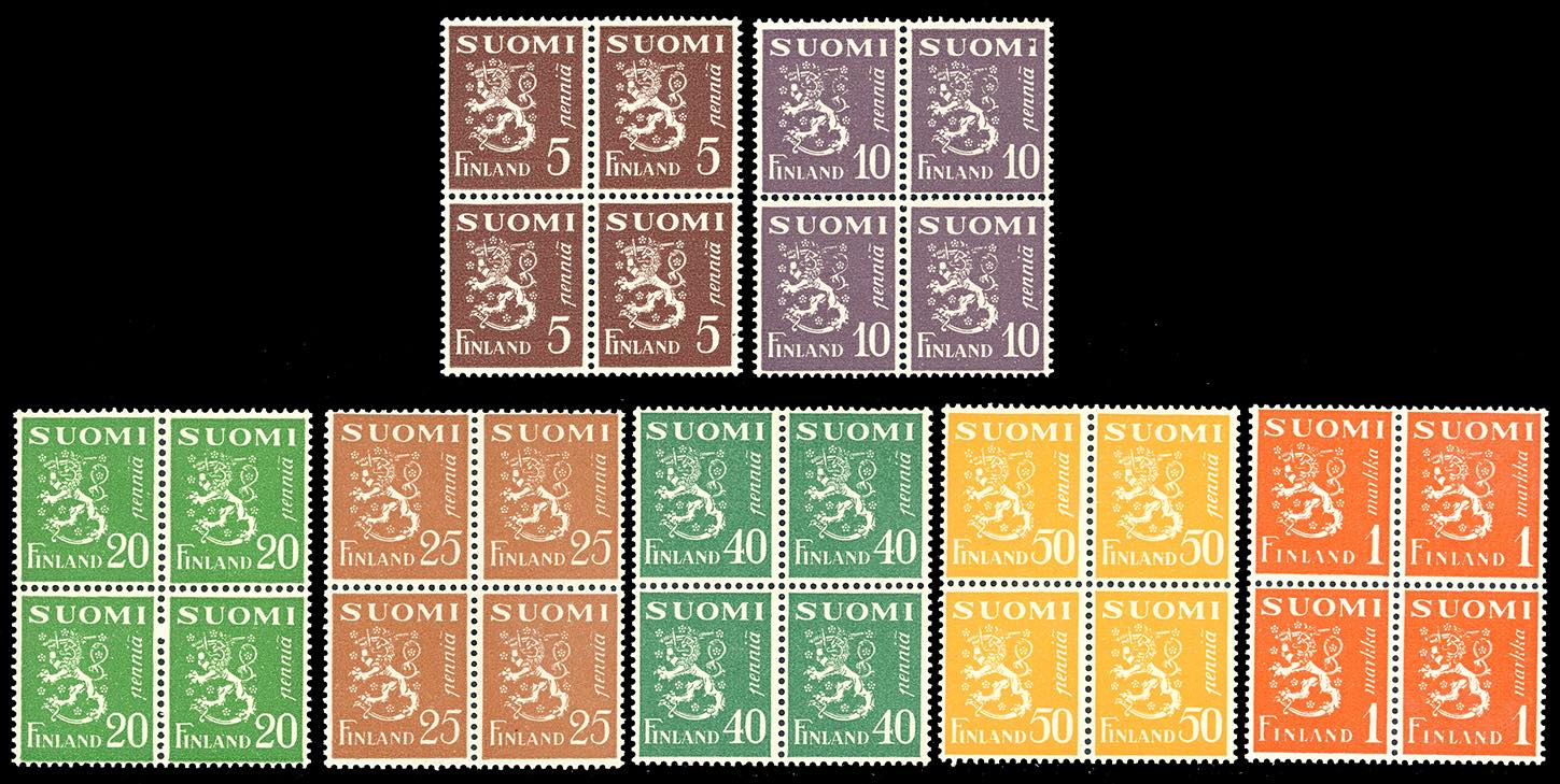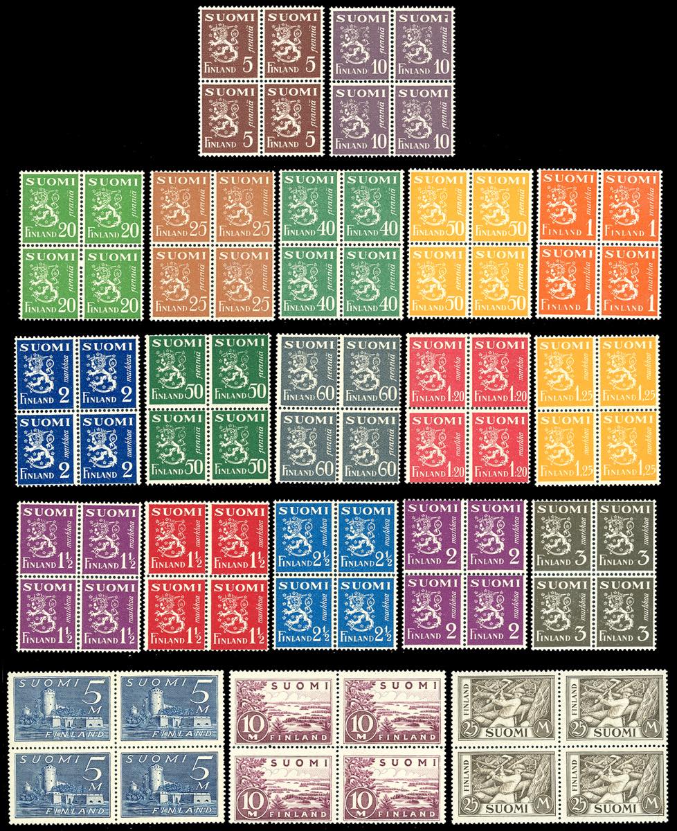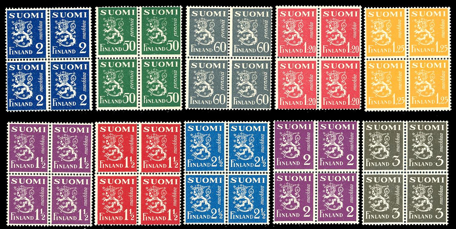 FINLANDIA 1930 - Leone rampante e soggetti vari (141/155), blocchi di quattro, nuovi, gomma originale integra, perfetti.