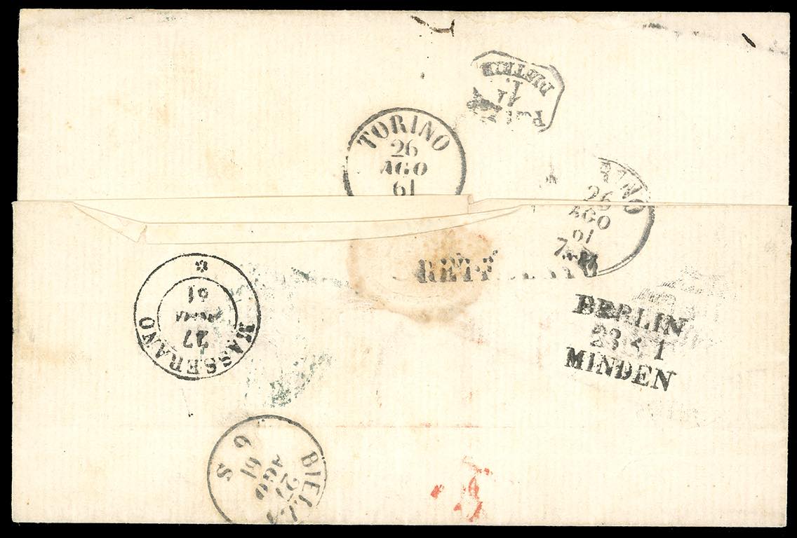 GERMANIA ANTICHI STATI HANNOVER 1861 - 2 gr. azzurro, due esemplari, 3 gr. ocra (18,19), su lettera da Clausthal 22/8/1861 a Torino, ... Read more