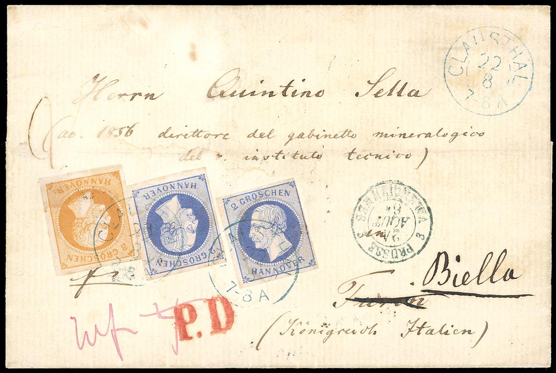 GERMANIA ANTICHI STATI HANNOVER 1861 - 2 gr. azzurro, due esemplari, 3 gr. ocra (18,19), su lettera da Clausthal 22/8/1861 a Torino, indirizzata a Quintino Sella, e da qui rispedita a Biella, diversi bolli al verso tra cui il lineare "retrodato". Rara e di ottimo aspetto.