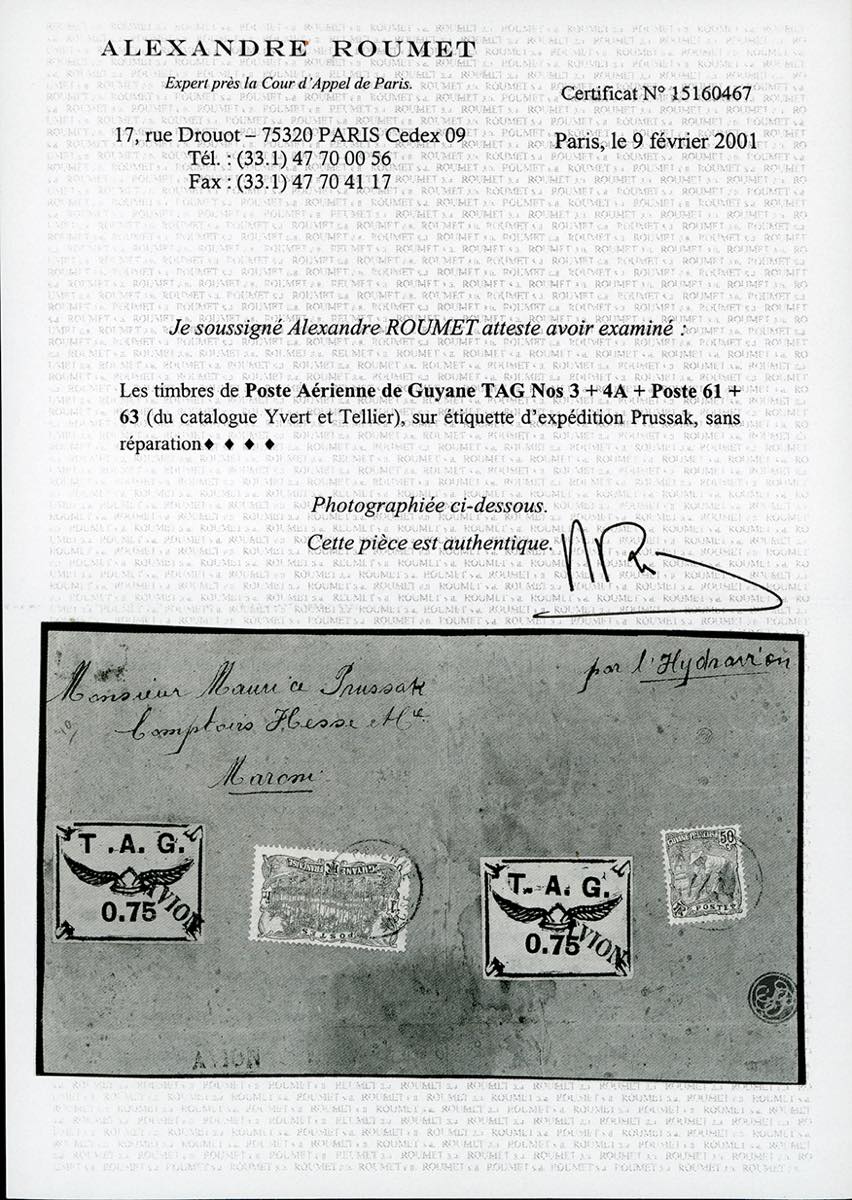 GUYANA FRANCESE POSTA AEREA 1921 - 0,75 fr. due esemplari, bianco e salmone, emissione di Cayenne (TAG N.3+4A), perfetti, 50 cent. e 1 fr. (Yv.61,63), perfetti, su grande brano di lettera, viaggiato per idrovolante. Molto bello e rarità del settore. Cert. Roumet.
