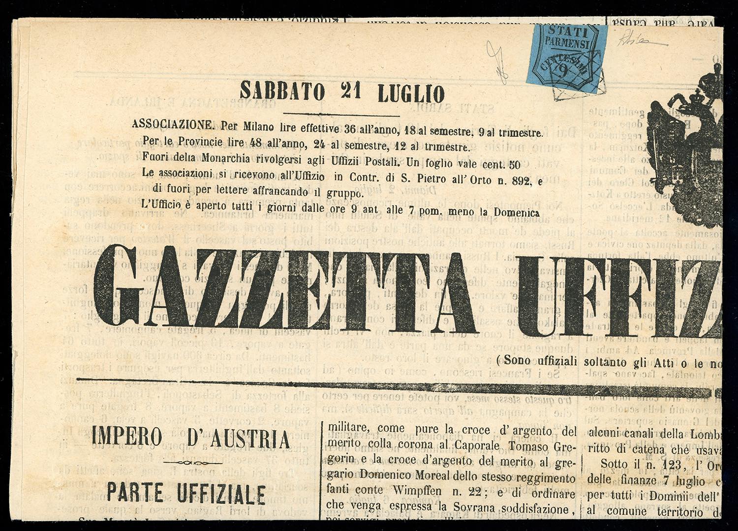 PARMA 1852/1859 - Cinque lettere e due giornali con affrancature del periodo. Notate alcune buone/ottime presenze e due certificati Diena. ... Read more