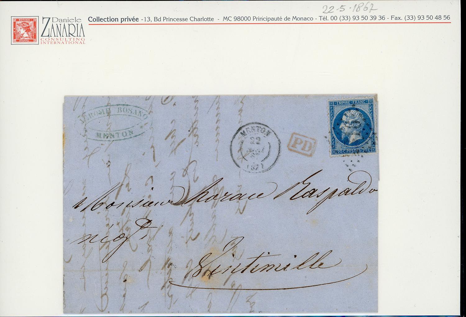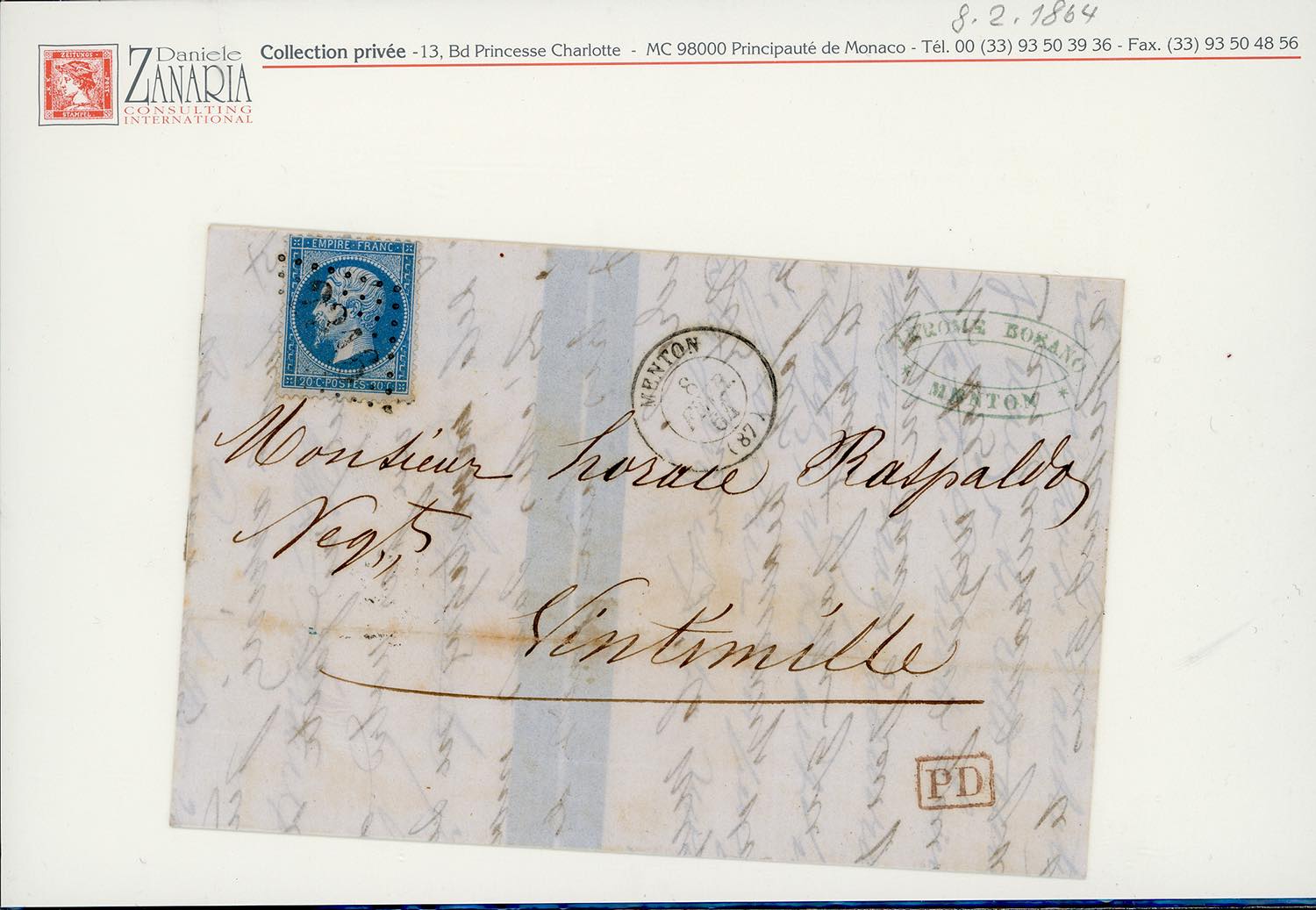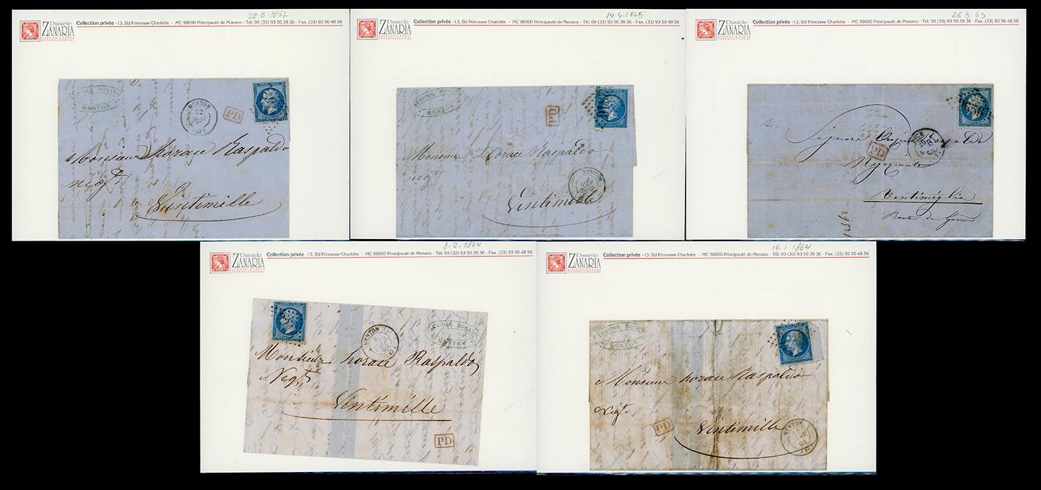 REGNO D'ITALIA INCOMING MAIL 1864/1867 - Cinque lettere affrancate con 20 cent. Napoleone (Francia n.22), quattro perfetti e uno leggermente difettoso, da Mentone a Ventimiglia, in tariffa di raggio limitrofo. Non comuni.