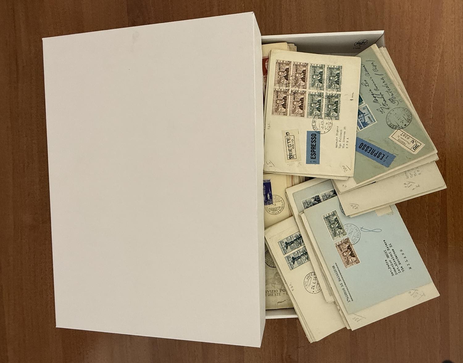 TRIESTE A AMG-FTT 1947/1954 - Accumulazione di svariate decine di buste affrancate con francobolli del periodo in una grande scatola, con molte ripetizioni. Alto valore di catalogo, ottimo per dettaglio.