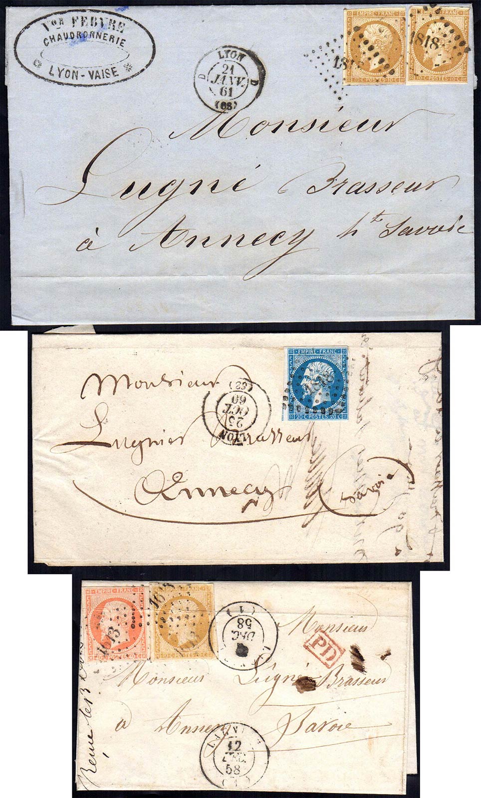 FRANCIA 1858/1861 - Tre lettere con interessanti affrancature dalla Francia per Annecy, in Savoia.