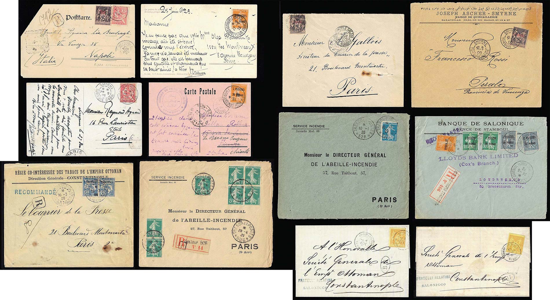 FRANCIA UFF. POSTALI ESTERO 1882/1923 - Dodici lettere/cartoline variamente affrancate con annulli del Levante. Notate interessanti presenze, merita esame.