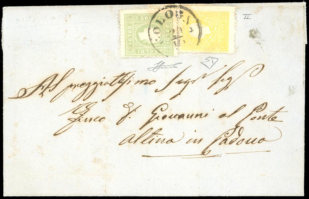 1863 - 2 soldi giallo, II tipo, 3 soldi verde giallo (28,35), perfetti, su lettera da Cologna 29/10/1863 a Padova. E.Diena, Ferrario.