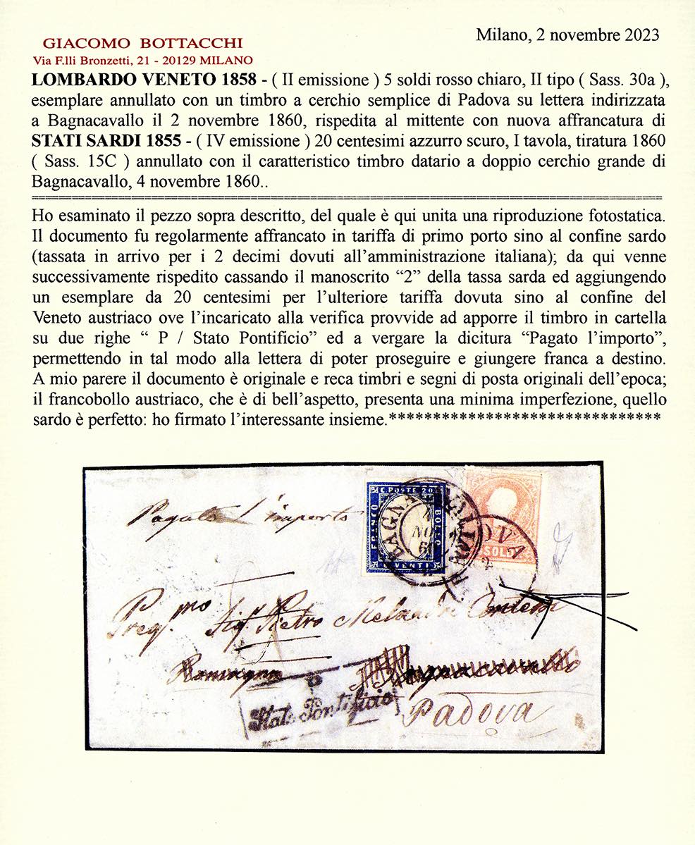 1860 - 5 soldi, II tipo (30a), leggermente difettoso in alto, su lettera da Padova 2/11/1860 a Bagnacavallo, tassata 20 centesimi, in seguito cassati, in aggiunta dicitura manoscritta "pagato l'importo". Da Bagnacavallo venne riaffrancata con 20 cent. di Sardegna (15C), perfetto, il 4/11/1860 e rispedita a Padova, con l'aggiunta del bollo "P-Stato Pontificio". Bella e rara affrancatura mista di rispedizione. Da esposizione! A.Diena, Ferrario, cert. Bottacchi. Ex coll. Imperato.