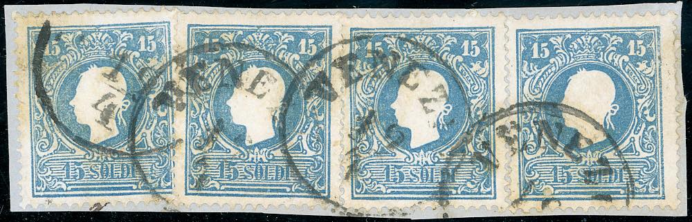 1859 - 15 soldi azzurro, II tipo (32), quattro esemplari perfetti, usati su frammento a Venezia. Bello e non comune. Ferrario.
