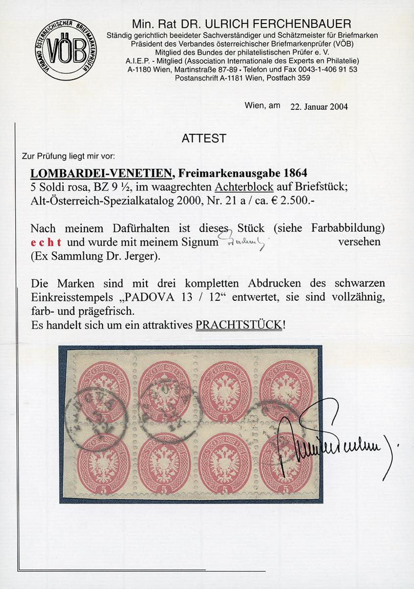 1864 - 5 soldi rosa, dent. 9 1/2 (43), eccezionale blocco di otto usato a Padova su frammento, perfetto. Raro! G.Colla, Ferrario, cert. Ferchenbauer.