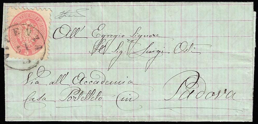1864 - 5 soldi rosa, dent. 9 1/2 (43), perfetto, su lettera di colore verde a quadretti rosa da Vicenza 31/3 a Padova. Curiosa! Ferrario.