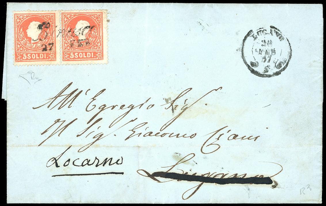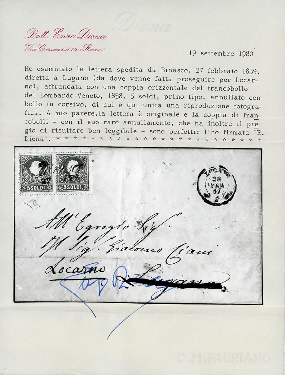 BINASCO, corsivo punti R2 - 5 soldi (25), due esemplari, perfetti, su lettera del 27/2/1859 a Lugano, rispedita a Locarno, in Svizzera. Raro annullo, ben leggibile e di ottima qualità. Molto interessante anche per la tariffa di raggio limitrofo. Insieme molto raro. Cert. E.Diena.