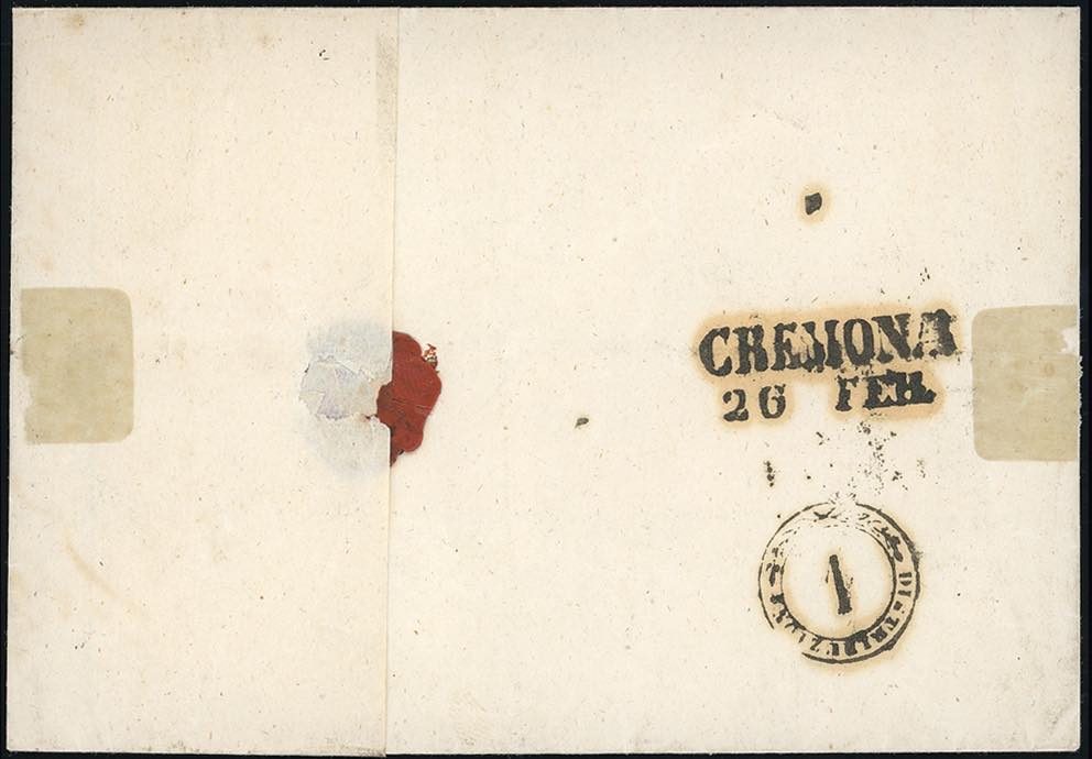 MELEGNANO, SD punti 12 - 15 cent. (3), giusto in un punto a sinistra, su sovracoperta di lettera del 25/2/1851 per Cremona. Molto fresca. ... Read more