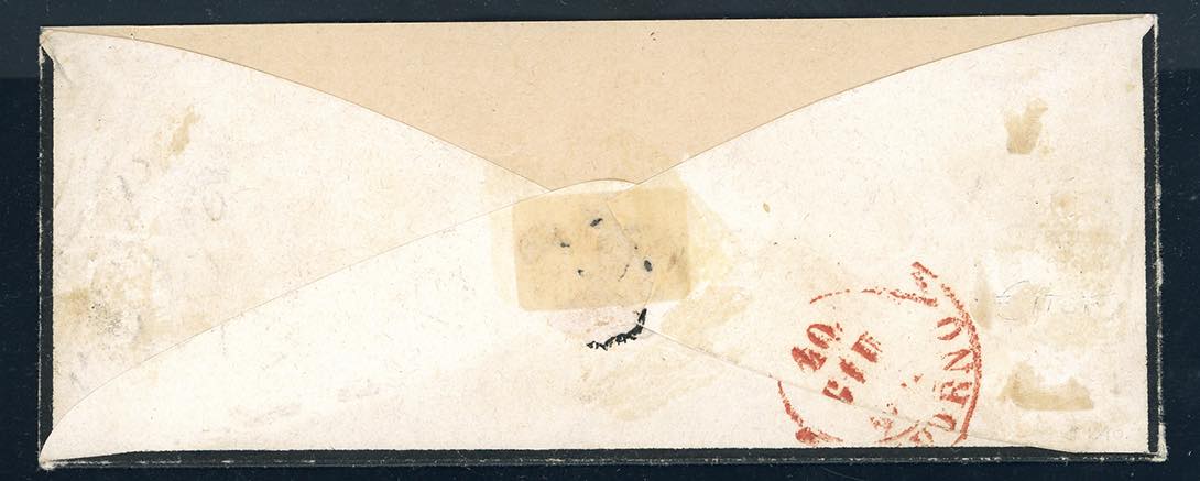 1855 - 10 cent. rosa, errore tipografico "N" coricata, 5 cent. verde oliva, entrambi con punto dopo le cifre (9i,8), perfetti, su piccola busta da Carrara 10/6/1855 a Livorno. Bella e molto rara. A.Diena, cert. Vaccari.