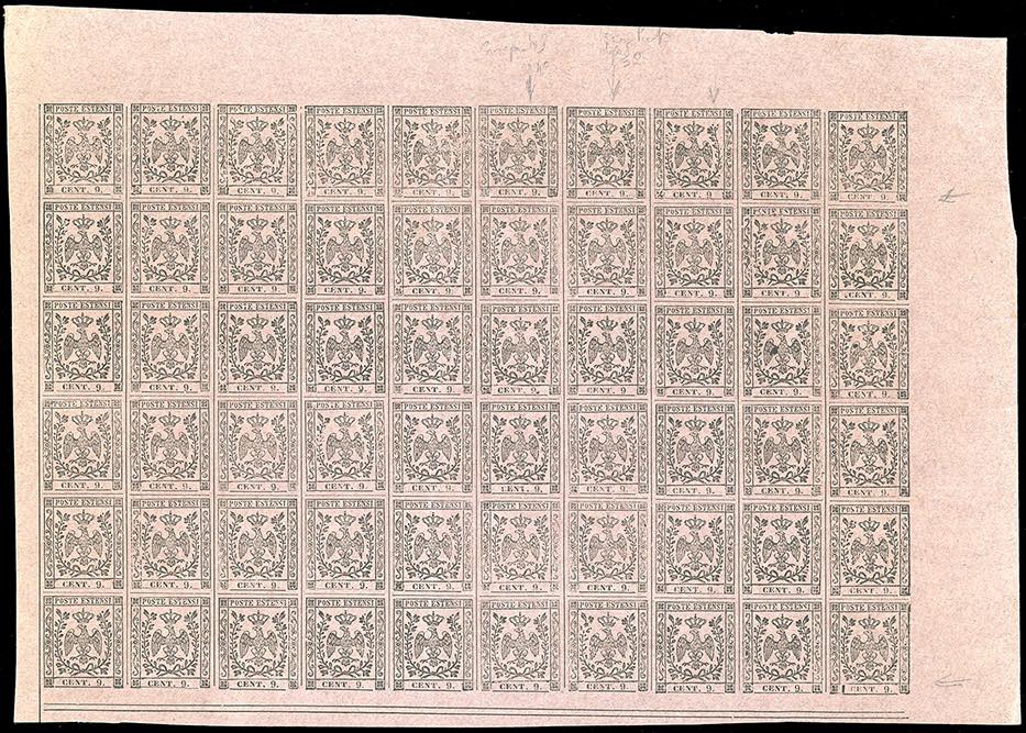 1855 - 9 cent. violetto grigio (3), non emesso, quartodi foglio di 60 esemplari, gomma originale integra, perfetto e molto fresco.