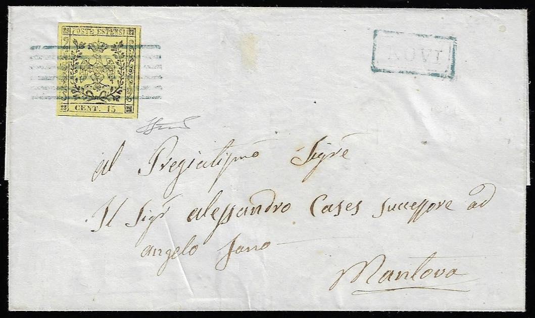 NOVI, 6 sbarre + cartella azzurri punti 10 - 15 cent. (3), perfetto, su sovracoperta di lettera per Mantova 9/3/1854.