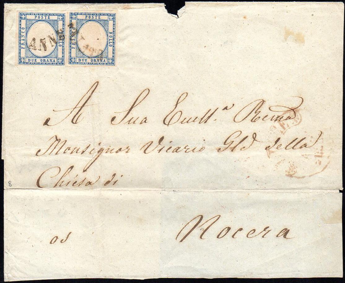 LECCE, svolazzo + cerchio rosso punti 8 -2 grana (20), due esemplari, su sovracoperta di lettera dell'aprile 1861 per Nocera.