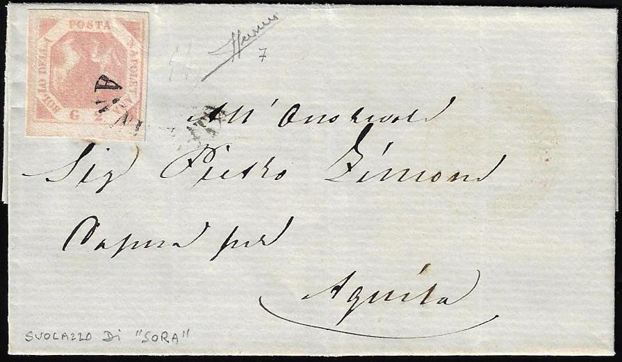 SORA, svolazzo + cerchio rosso punti 11 - 2 grana (7), perfetto, su lettera del 4/3/1861, cerchio rosso debolmente impresso, per Aquila. ... Read more