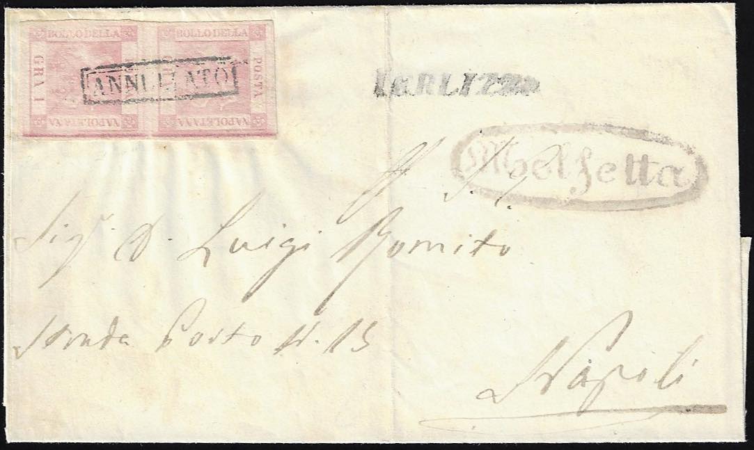 TERLIZZI, lineare + annullato e ovale di Molfetta punti 9 - 1 grano (3a), coppia, perfetta, su sovracoperta di lettera per Napoli 25/3/1859.
