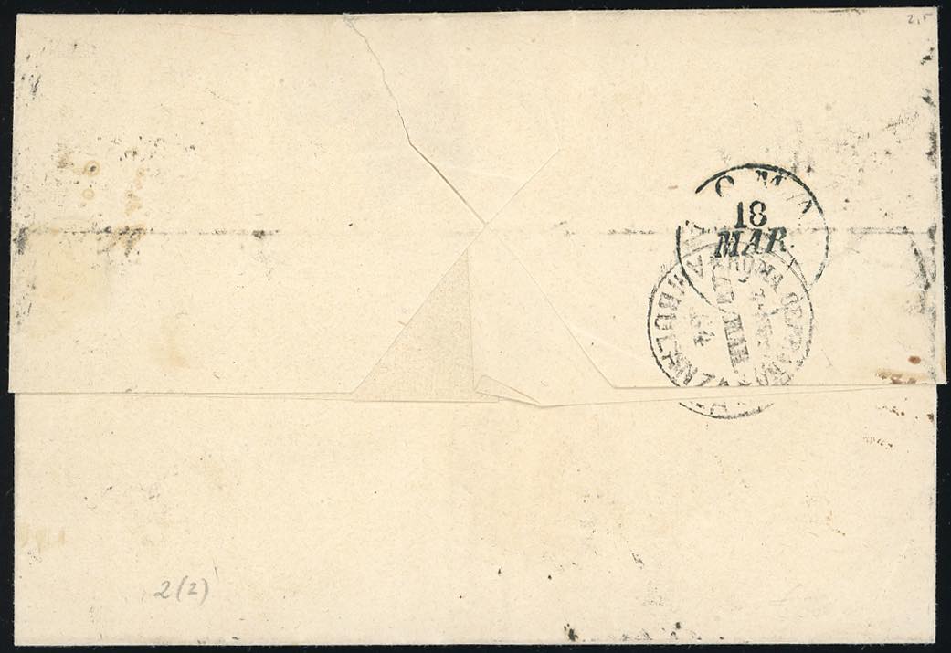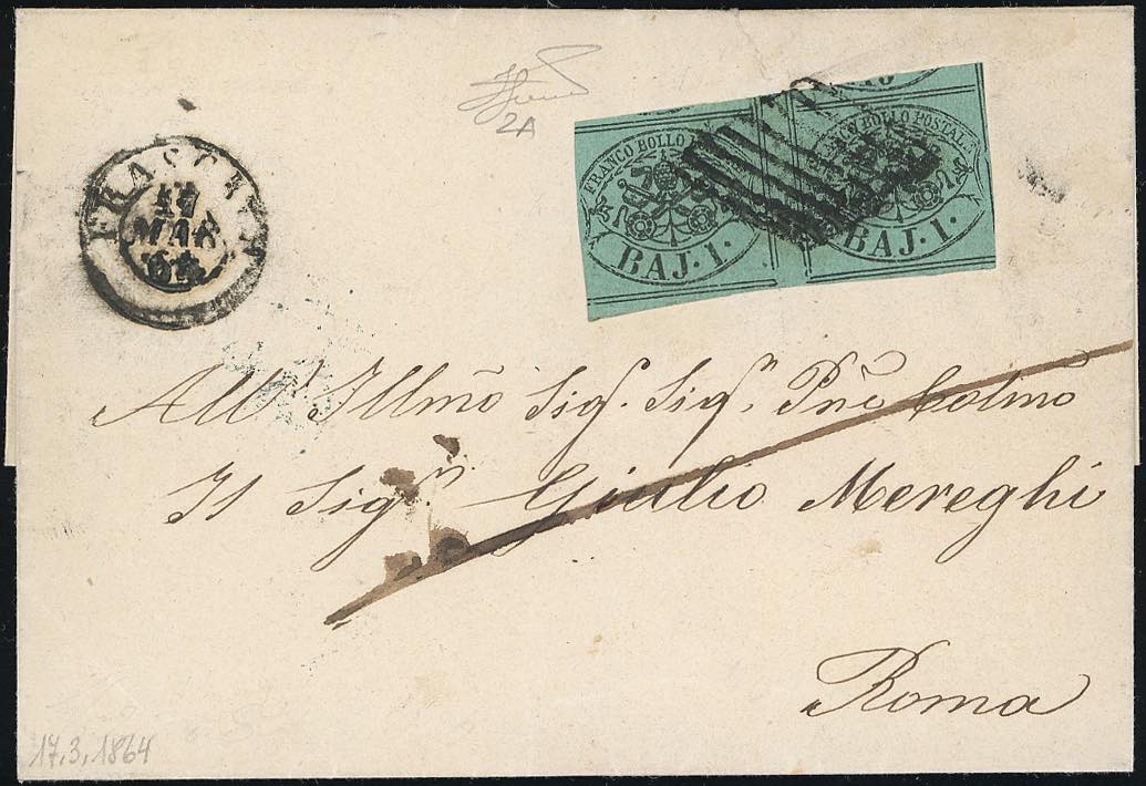 1864 - 1 baj verde scuro, I composizione (2A), coppia orizzontale con interspazio di gruppo, perfetta, su sovracoperta di lettera da Frascati 17/3/1864 a Roma. Non comune. Cert. Ferrario.